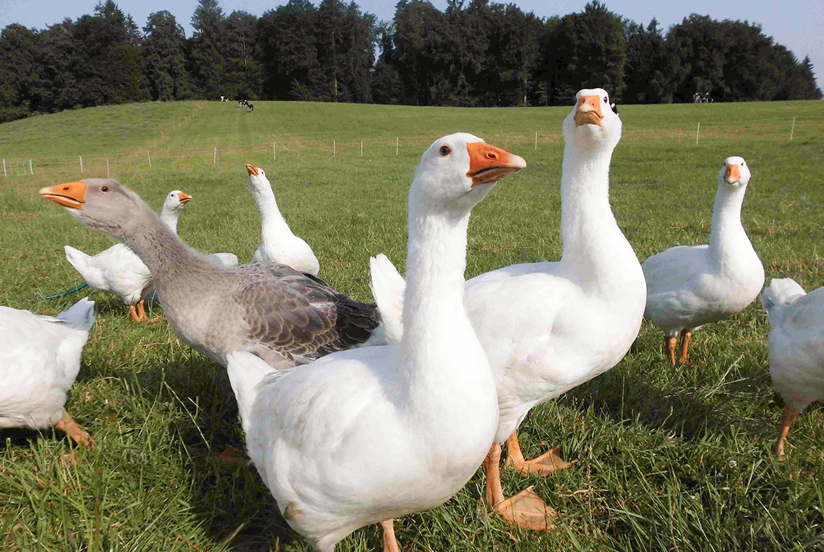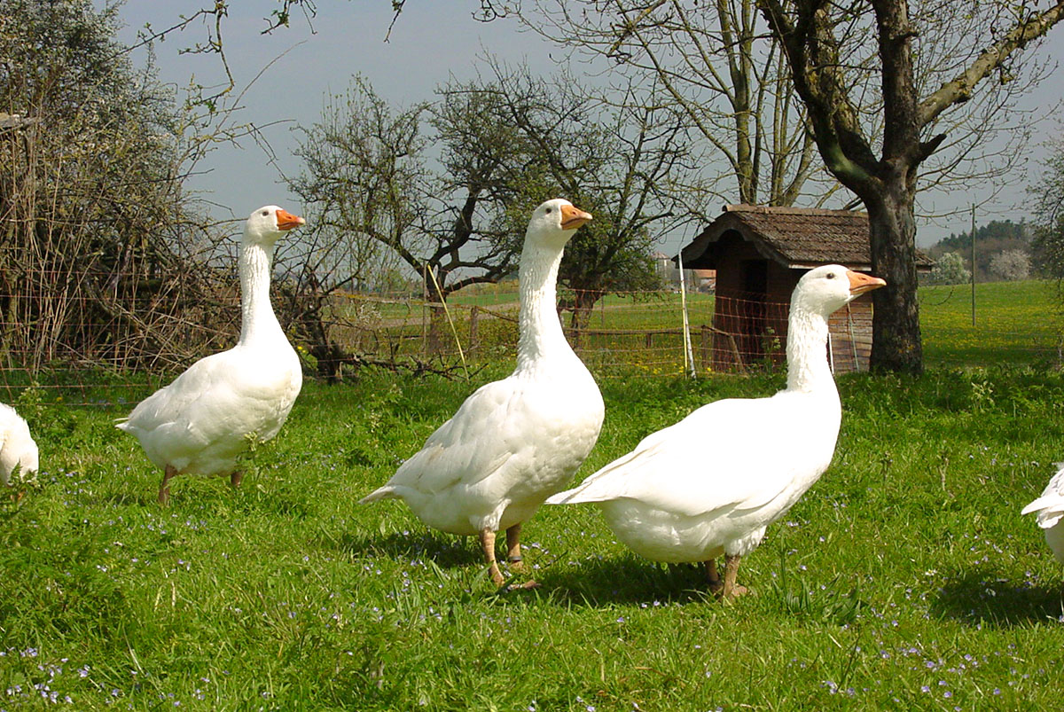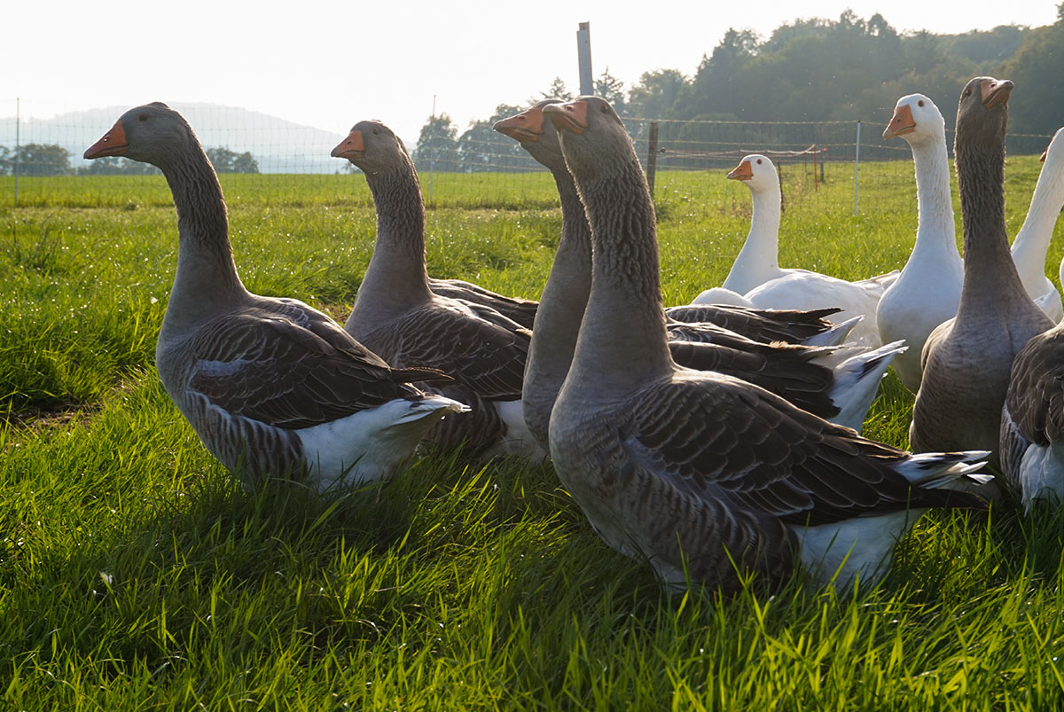 L'aliment de base des oies de pâturage se compose d'herbe fraîche, contrairement aux oies engraissées de manière intensive. Le but est d'élever les animaux de manière la plus naturelle possible afin qu'ils atteignent un poids d'abattage raisonnable. Grâce à sa saisonnalité et sa détention extensive (pâturage), l'oie de pâturage est un animal de rente idéal durant la période de végétation. Les oies de pâturage apportent une plus-value aux producteurs ainsi qu'au consommateur. La détention naturelle est en harmonie avec les convictions de nos producteurs et amène à un produit de qualité pour le gourmet.